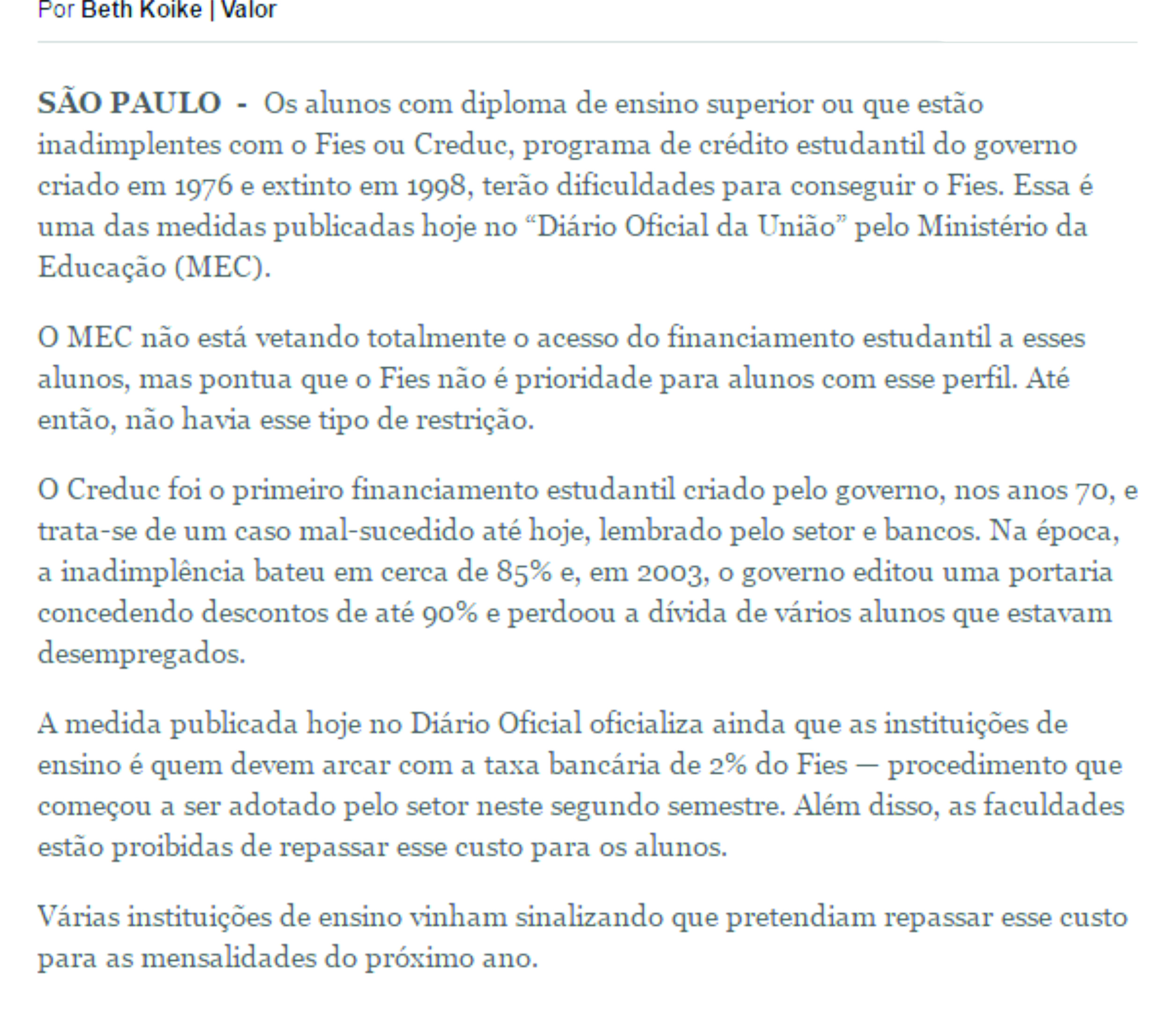 Fonte: http://www.valor.com.br/empresas/4794617/fies-prioriza-alunos-adimplentes-e-sem-diploma-de-ensino-superior